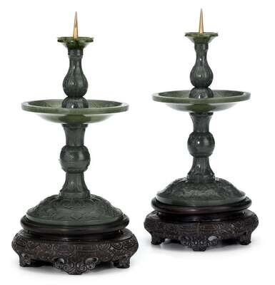 Pair of Chinese spinach jade pricket altar sticks 18th century