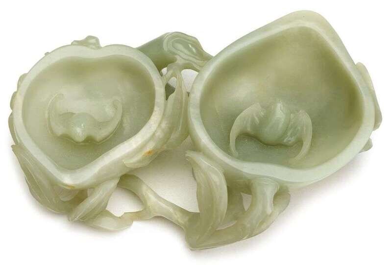 Modeled as reversed peach halves carved with bats to the interior and flanked by vine and leaves.