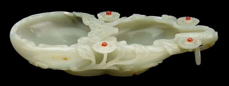 The well-hollowed, double-gourd washer carved with several adornments to top, sides and base: Mughal-style flowers with inset red stones, a carved chime, a freely hanging ring handle and a double coin base platform.