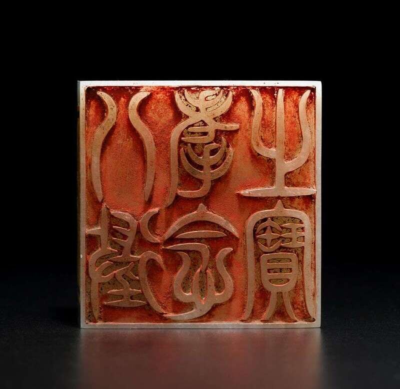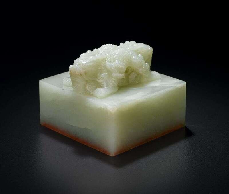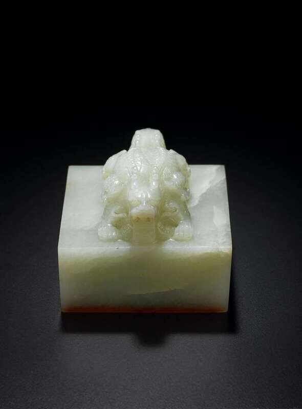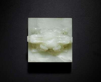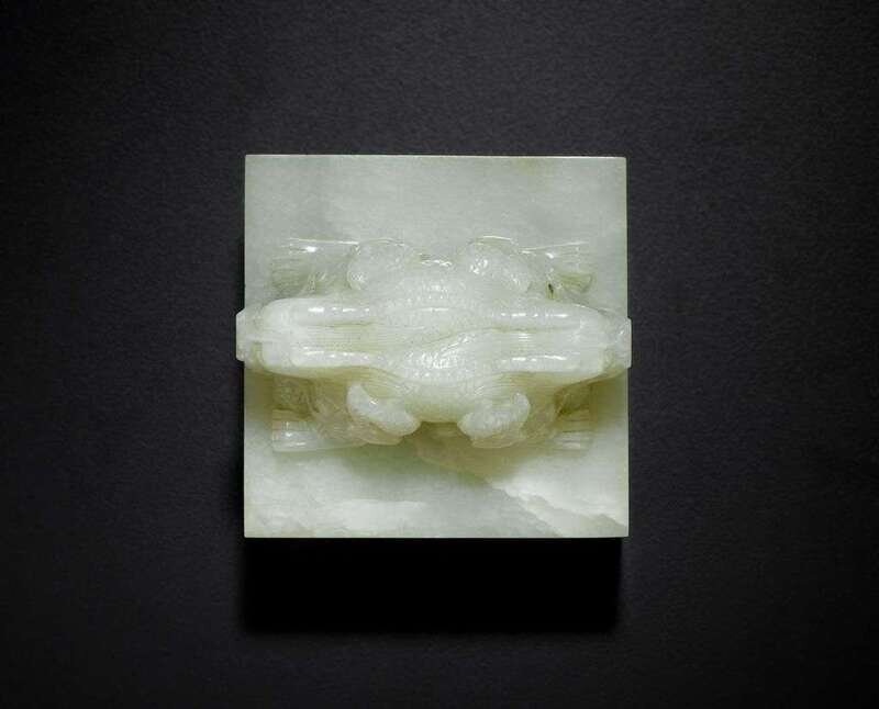 Square form surmounted by addorsed dragons, the powerful head carved with bulging eyes and flared nostrils issuing scrolling whiskers, over delicately interlaced scaly bodies. Seal reading 'Bazheng maonian zhibao'.