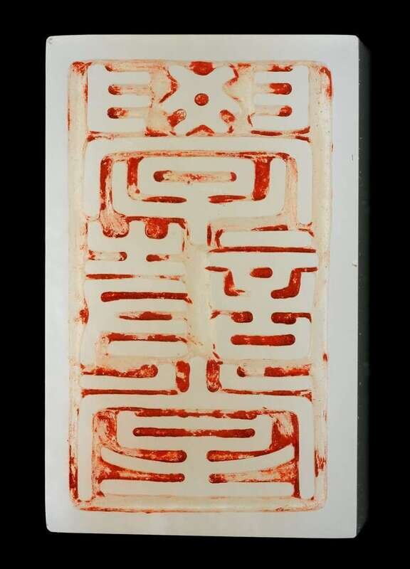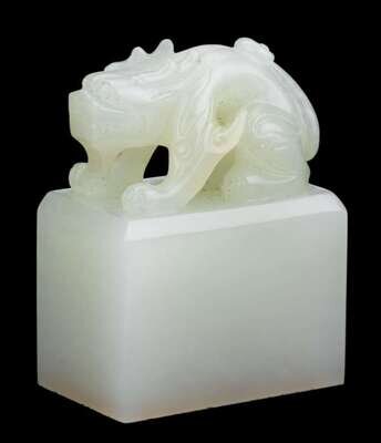 The imperial-type beveled rectangular seal surmounted by an openwork qilin; stone of pure white hue; with fitted platform box.