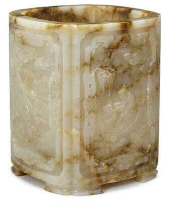The rounded, square-form pot carved to sides with relief panels depicting elder wise men with youthful acolytes in idyllic natural settings; stone of white hue with extensive brown and gray inclusions.