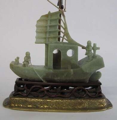 The single-cabin, flat-hulled boat carved with a single sail and two young sailors; stone of mottled celadon hue; mounted to wooden and brass lamp base.