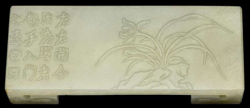 Long rectangular form, carved with narcissus and poetic scrip over Greek key to edge.