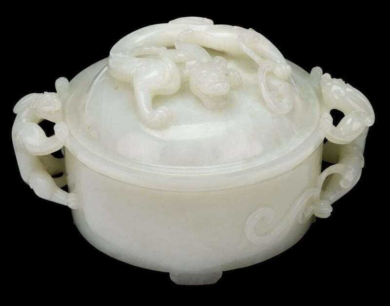 The circular vessel with twin qilong handles and four slight feet surmounted by domed cover with carved openwork qilong.