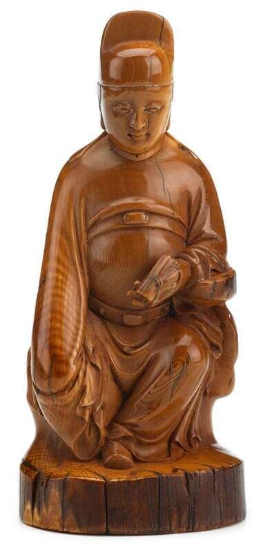 The small and detailed seated figure carved in the hat and robes symbolic of his position and holding a scroll; ivory of burnished coffee tone with darker surface to base.