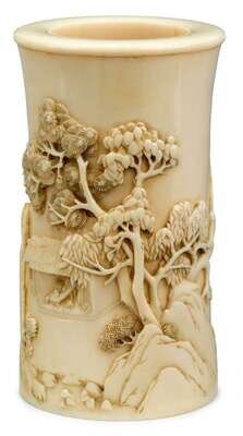 The small and concave cylindrical pot carved in relief to show two small figures walking near a small house among rocks and trees.