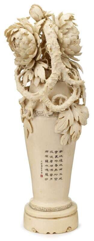 The tall and solid carving depicts a large bunch of blossoms issuing from a high-shouldered vase on a circular base; signed and inscribed with poetic script.