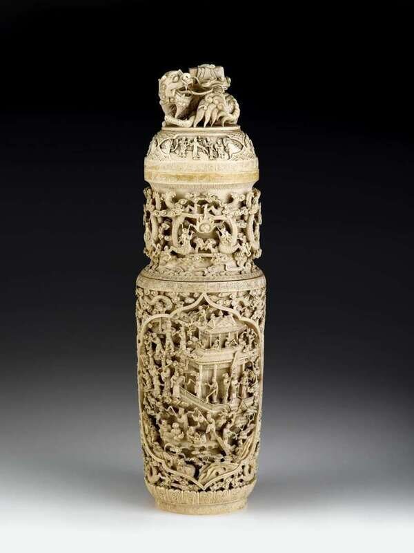 The tall cylindrical vase carved in intricate and deep relief to show two large cartouches containing an assemblage of legendary figures in and around outdoor pavilions; the neck and ground carved with dragons pursuing flaming pearls among celestial clouds; the cover surmounted by a recumbent qilin exhaling cloudy vapor that supports a sealed box.