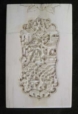 The rectangular case carved to sides with cartouches showing figures in an outdoor village scene.