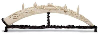 The tusk of convex form, carved to show village with applied ivory pagodas, on silver wire inlaid stand.