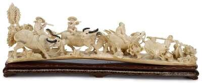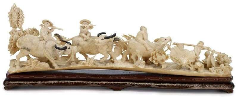 Long slightly convex form, well carved to show boys with a team of buffalo, over inlaid wood stand.