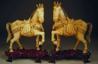 The mirrored pair of prancing horses decorated with ink-work and colored beads.