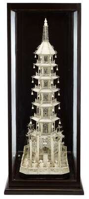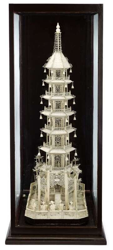 The tall multi-tiered model set in a figural courtyard, in a wood and glass display case.