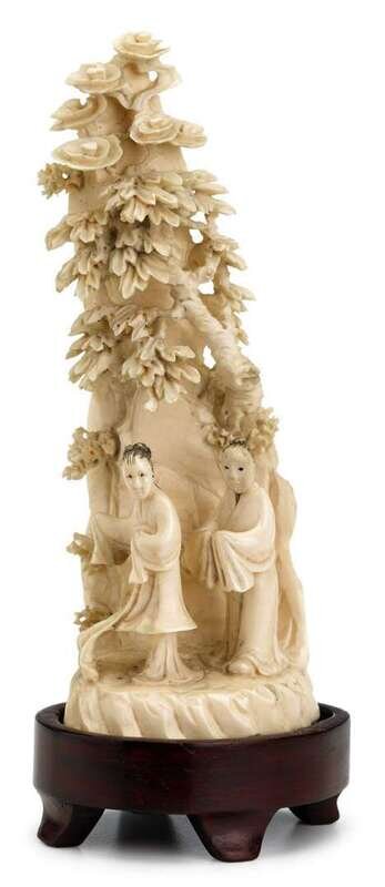 The figural carving depicts a scholar and beauty below a spreading tree in a rocky setting; signed and inscribed.