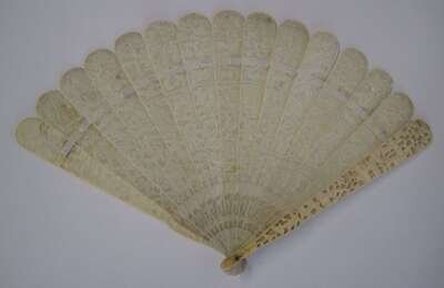 Ivory fan of typical form with relief carved guards and lattice carved sticks depicting figures in a wooded village.