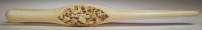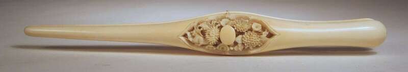 The joined ivory halves carved in relief to show figures in a garden landscape and a bunch of blossoms respectively.