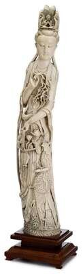 The tall and finely-detailed goddess dressed in the flowing robes and fancy coiffure typical of the subject holds a leafy branch and a flower basket beside a standing phoenix; with openwork sections and an articulated chain issuing from basket; mounted to wooden stand.