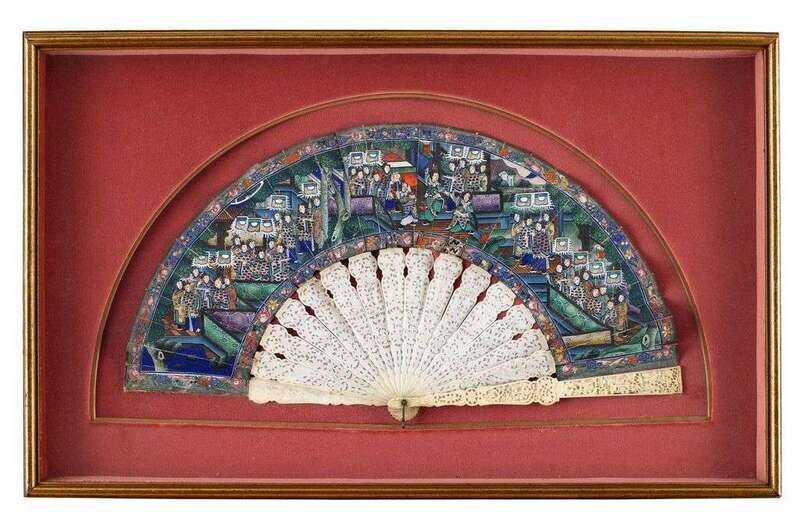 Of typical ornate form with intricately-carved guards and pierced sticks supporting a painted paper leaf featuring several figures with ivory faces; mounted in a glazed shadowbox frame.