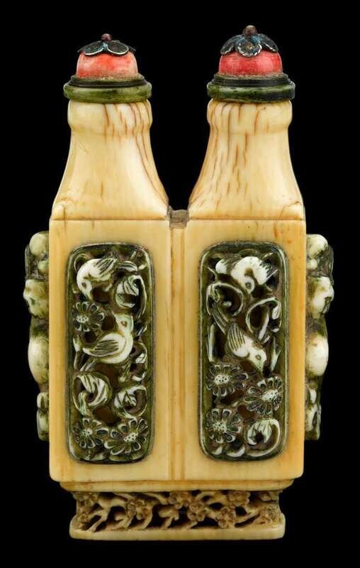 The exceptional double bottle of square form with tapering necks and an openwork floral base; body carved with openwork panels of birds and flowers to create double-wall effect; panels, qilong carvings to sides and caps stained with dark green and red.