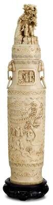 The figural cover surmounts a baluster base, carved in medium relief to show figural panels within lotus bands, raised on wood stand.
