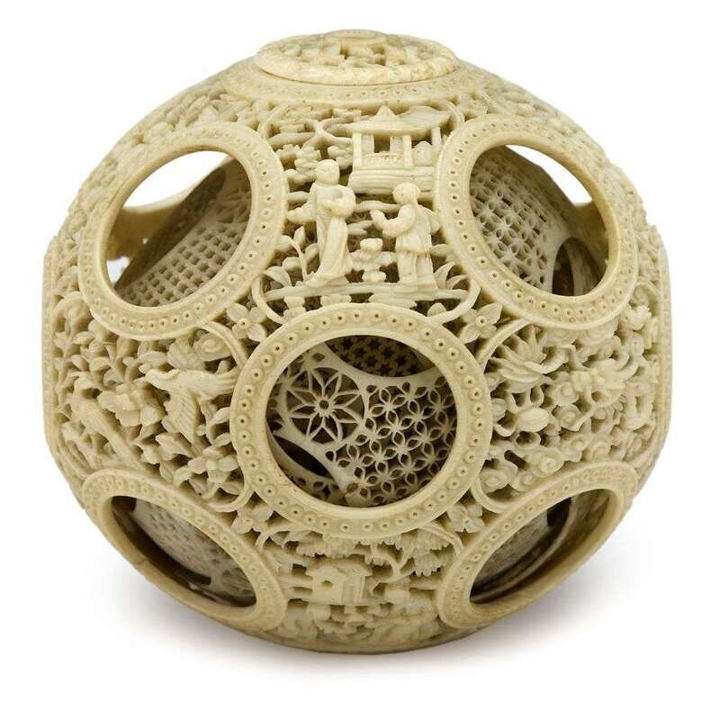 The rounded, latticework ball carved in many layers and depicts figures, birds, dragons and flowers among the fourteen circular openings in outer layer.