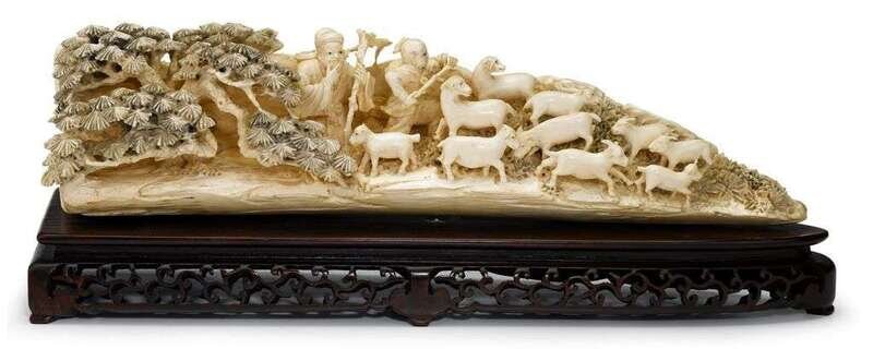 The large end-of-tusk carving depicts an elder and youthful goatherd with their flock among bushes and a spreading pine tree.
