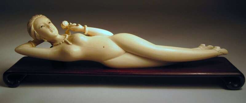 The reclining elongated figure carved in a typical, somewhat suggestive manner with heeled shoes, freely carved bangles, a beaded necklace and holding a rose.