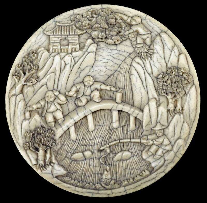 Circular form, carved in high relief to show boys at play among fishing hamlet.