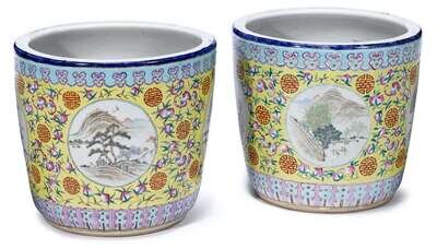 The large and tapering vessels enameled to exterior with four circular landscape scenes among peaches and shou symbols over a yellow ground between a lappet band at base and a lingzhi band at rim.