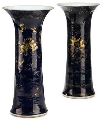 Matched pair of Chinese powder blue and gilt-painted beaker vases qing dynasty