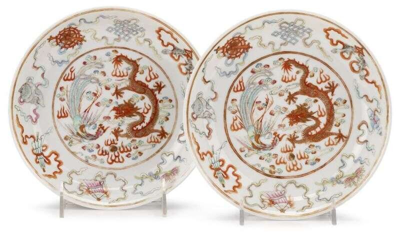 Pair of Chinese porcelain dragon and phoenix saucer dishes yongzheng mark, 19th century