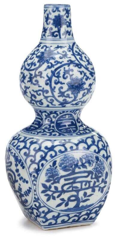 Of double gourd form with a slightly squared base decorated in cobalt blue with four cartouches containing "fu shou kang ning" written in flowering branches; lotus scroll and a swirl ground throughout.