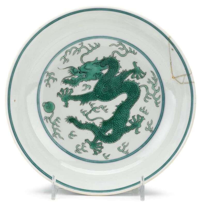 Of typical shallow form and enameled with a green dragon pursuing a flaming pearl to interior and two similar dragons to exterior wall.