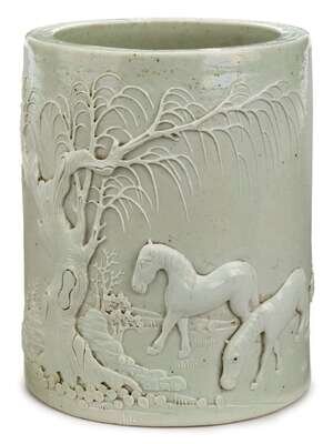 Tall cylindrical form, applied and carved to show horse below pine tree over rock-work base, incised mark to base, light green glaze, unglazed foot rim.