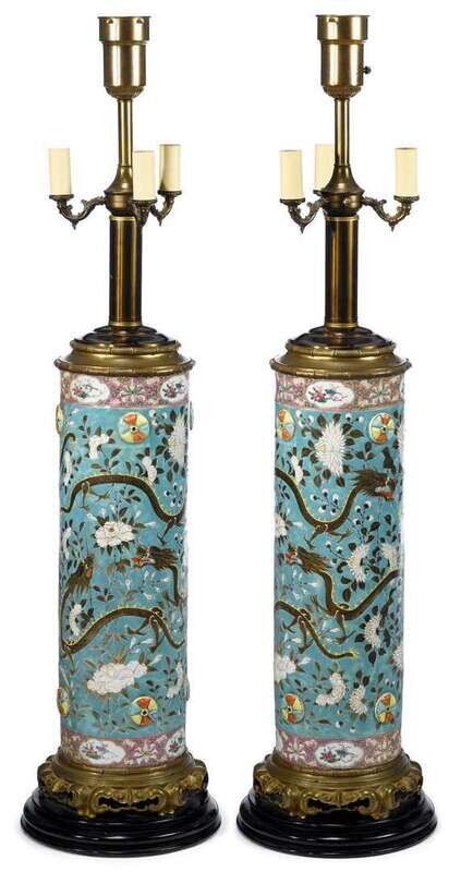 The large cylindrical vases enameled to show coiling dragons and white blossoms over a turquoise ground; with applied and pierced raised roundels and pink ground bands at neck and foot; mounted to good openwork bronze bases and fitted as lamps.