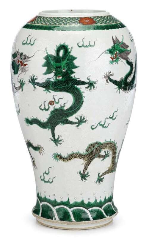 Of reduced yen yen form with a slight refinished rim; white ground carved with wave pattern and enameled to show five dragons pursuing flaming pearls between a wave band at base and a diaper band at shoulder.
