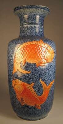 Flared mouth over cylindrical body molded with carp on near robin egg ground.