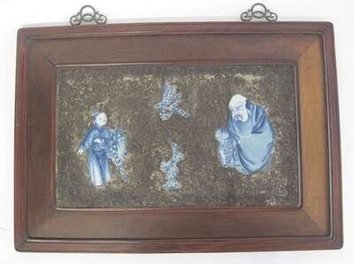 The rectangular earthenware plaque inset with blue and white porcelain figures and characters symbolizing a long life and covered with granulated obsidian; mounted in wood frame.