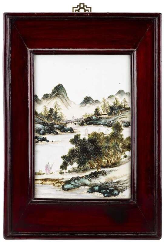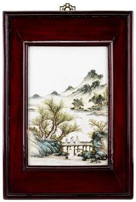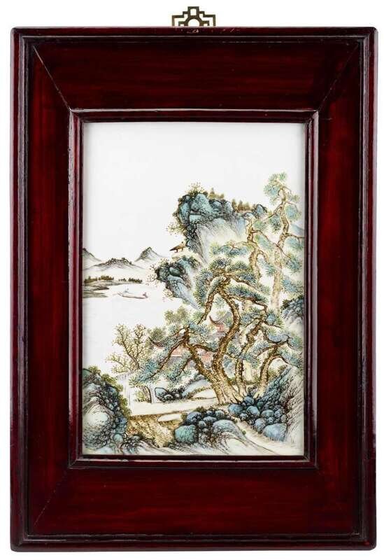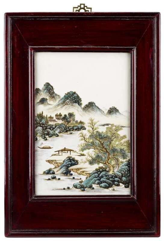 The four vertically aligned plaques depict figures, boats and architectural structures among rocks and trees in an idyllic mountainous lakeside landscape.