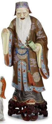 The expertly-molded standing figure depicts the Taoist Immortal dressed in a luxurious brown-ground robe adorned with shou symbols and holding his fish drum; affixed to wooden base.