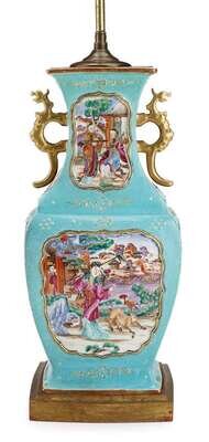 Mounted as a lamp, square baluster form, gilded molded handles to shoulders over molded and enameled body showing figural scenes within turquoise ground.