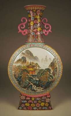 The vividly enameled vase decorated with traditional landscapes to sides of flattened round body; with long neck and delicate twin handles.