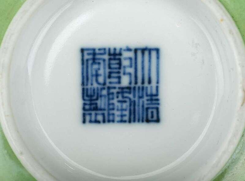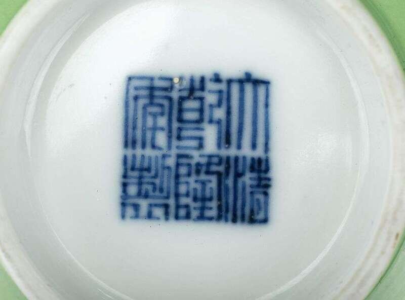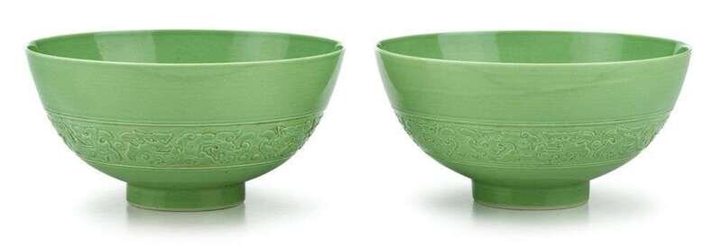 Pair of Chinese carved lime green monochrome porcelain bowls qianlong seal mark
