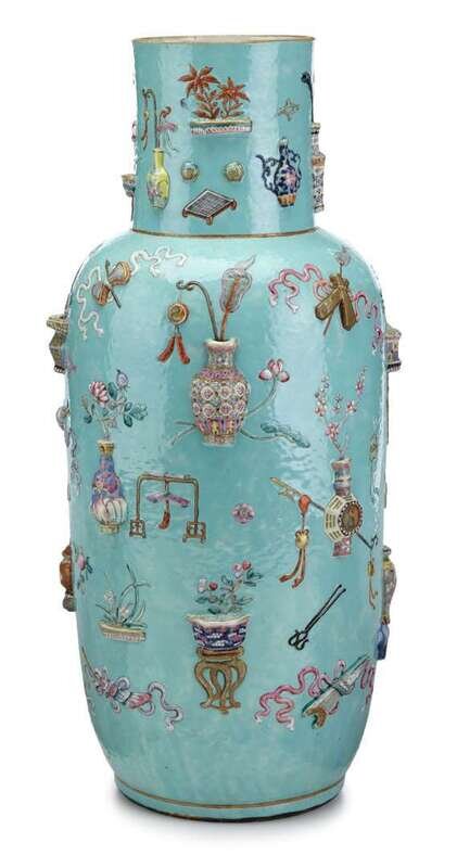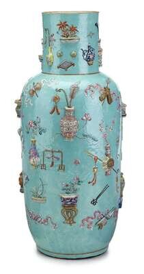 The tall vase applied to show various antique vases and censers on light blue or turquoise ground.