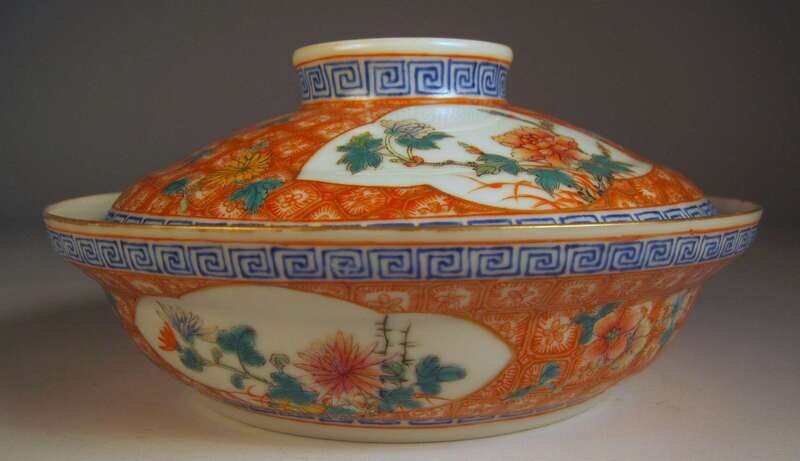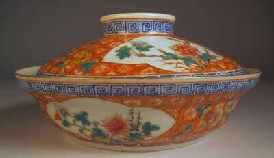 The waisted shallow bowl decorated with two floral cartouches and other flowers over an orange and gilt painted diaper ground between key bands at foot and rim; with similarly decorated conforming cover.