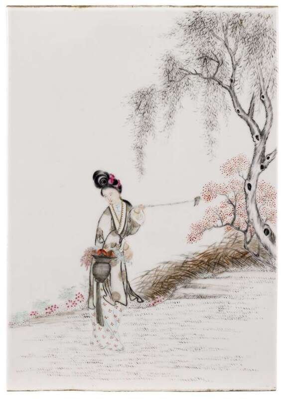 The rectangular plaque depicts a meiren with a fruit and vegetable basket on one arm and a net for catching butterflies in the other standing before a willow tree.