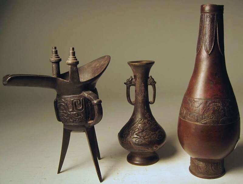 Comprising a pear form vase, jue, and twin handle baluster vase, all brown patina.