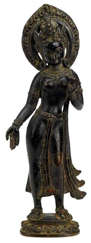 Heavy casting, tall female deity raised on single lotus throne, signs of polychrome decoration.