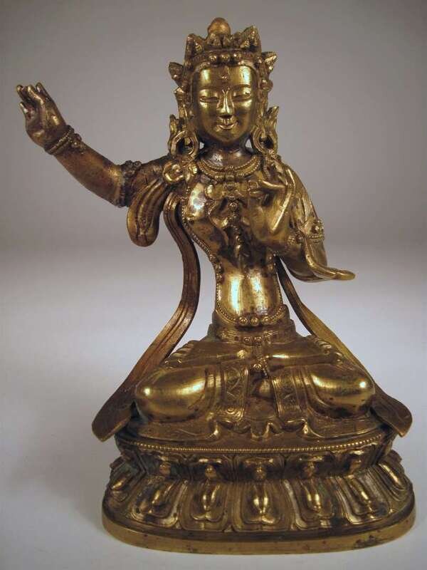 Seated female deity raised on double lotus throne, possibly Mongolian; replacements.